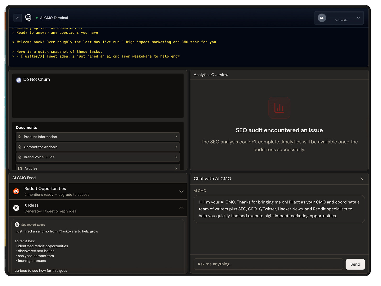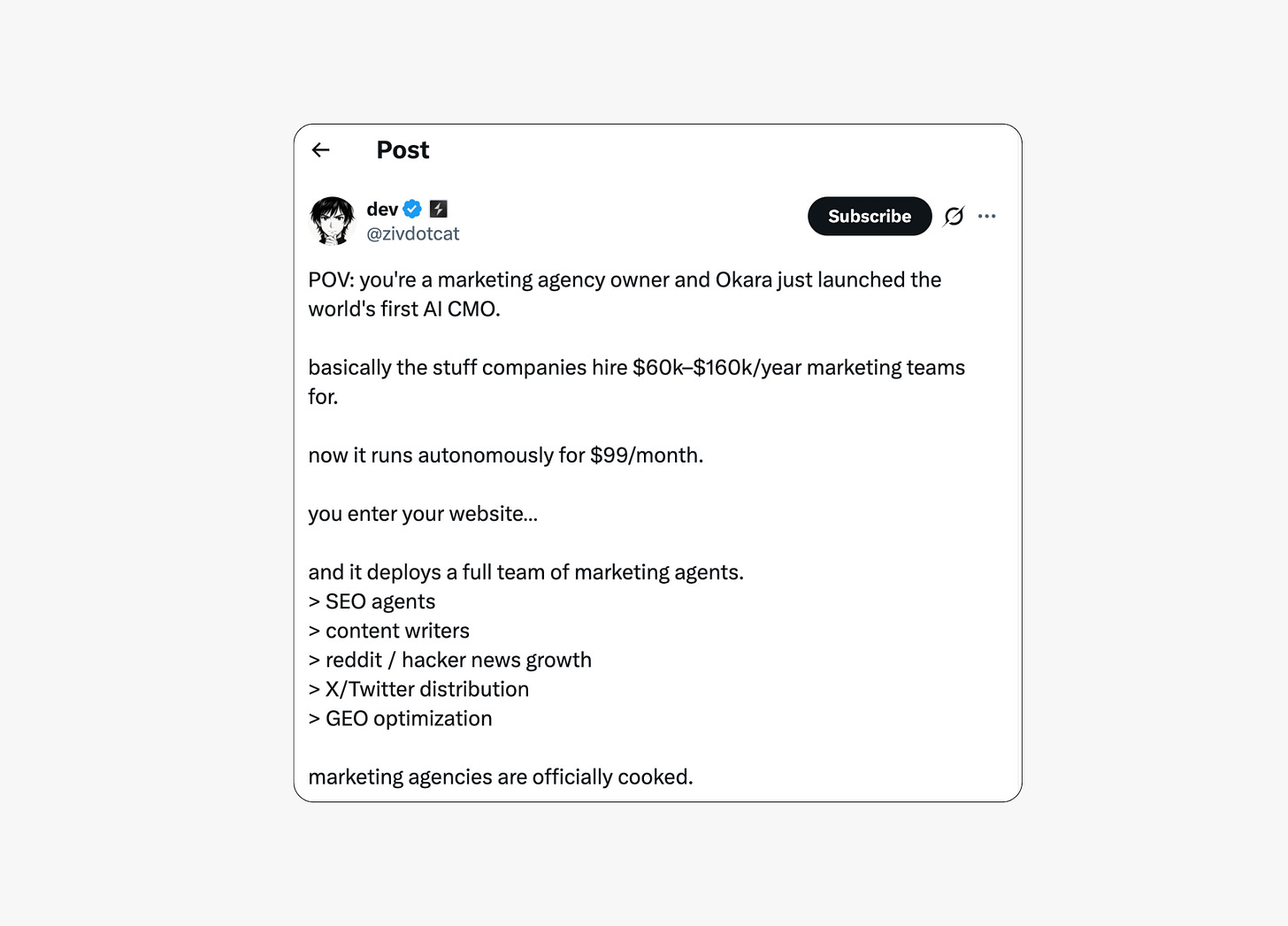 What no one is saying loudly enough is what Okara -- and any AI CMO -- structurally cannot replace: strategy and taste. An agent can audit your site, fix your meta descriptions, and schedule your posts. It cannot tell you whether your positioning is wrong, whether you’re talking to the right audience, or whether the angle of your content is interesting enough for anyone to care. Those decisions don’t live in a prompt. They live in a founder’s judgment about their market, their product, and what makes their thing worth finding in the first place. The tools that survive long-term will be the ones that amplify good taste -- not the ones that promise to substitute for it.