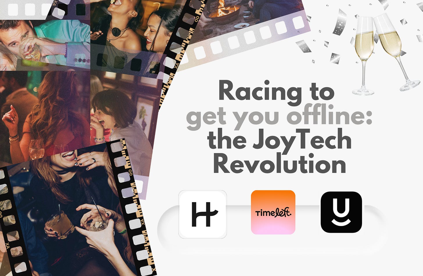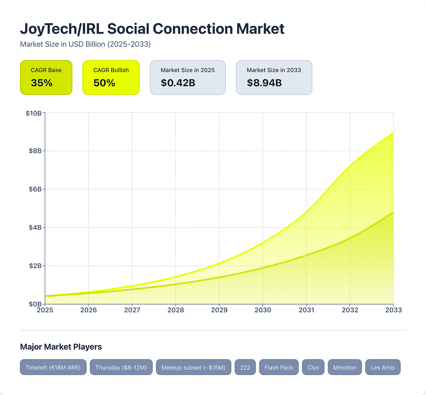 Market at a glance: The JoyTech/IRL Social Connection market is an emerging category without formal market research from established firms. The 2025 baseline ($420M) aggregates revenue from Timeleft (€18M ARR, founder-stated), Thursday ($8-12M estimated from event attendance), and 15+ emerging platforms.