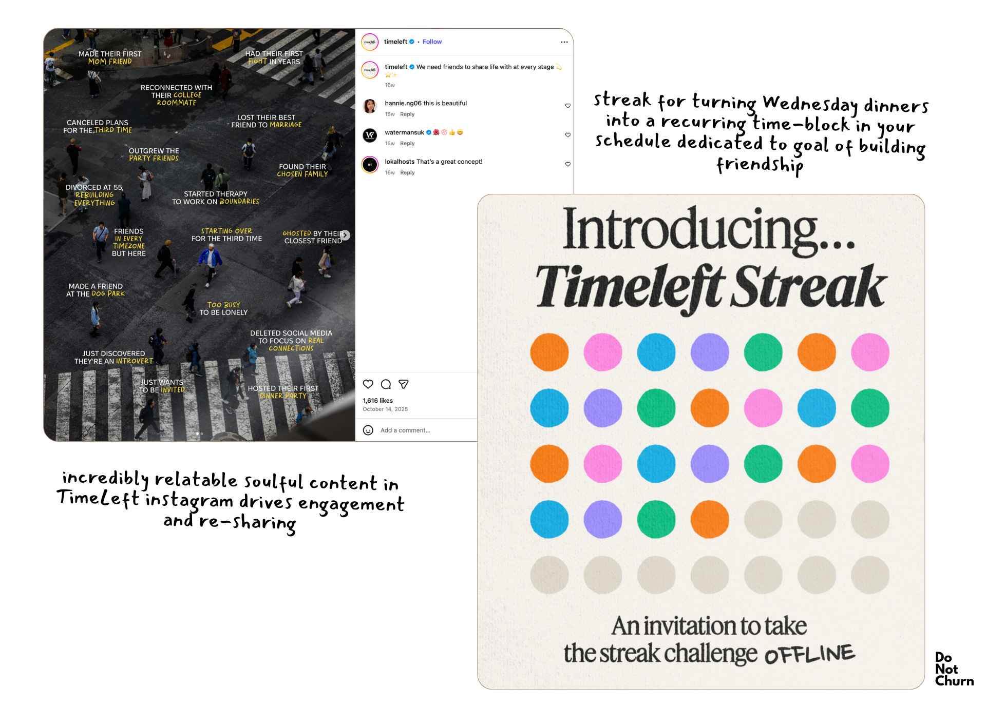 Why it prevents churn: Behavioral science shows habits need consistency + trigger + reward. Timeleft provides all three. Breaking the streak feels like missing yoga class—you notice the absence.