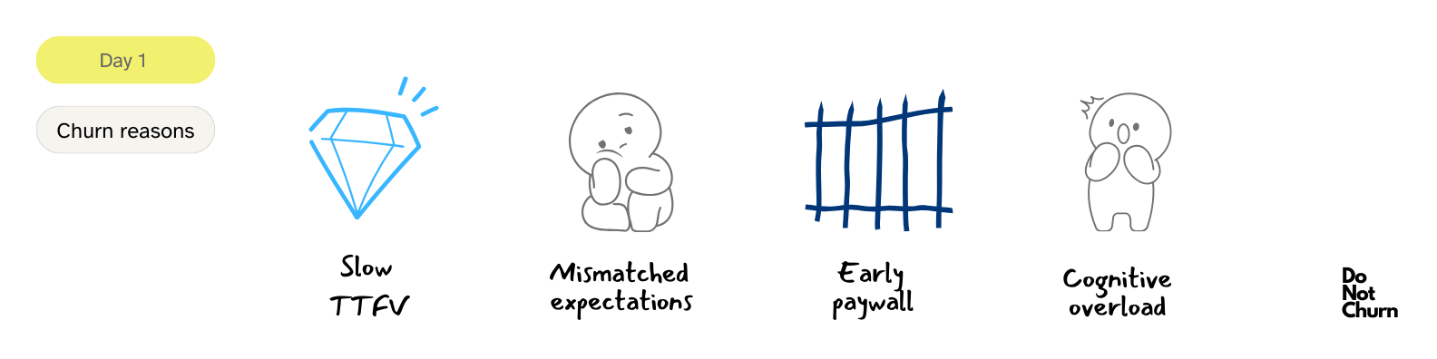 That’s why long onboarding, mandatory signup, and early paywalls convert curiosity into instant abandonment that results in 70–75% D1 churn.