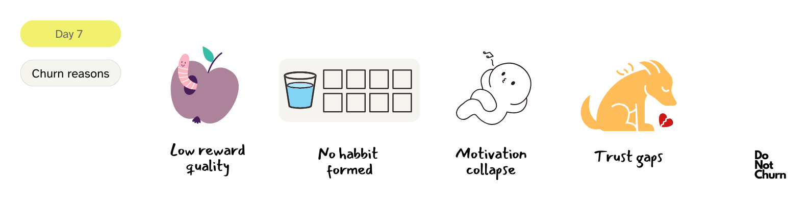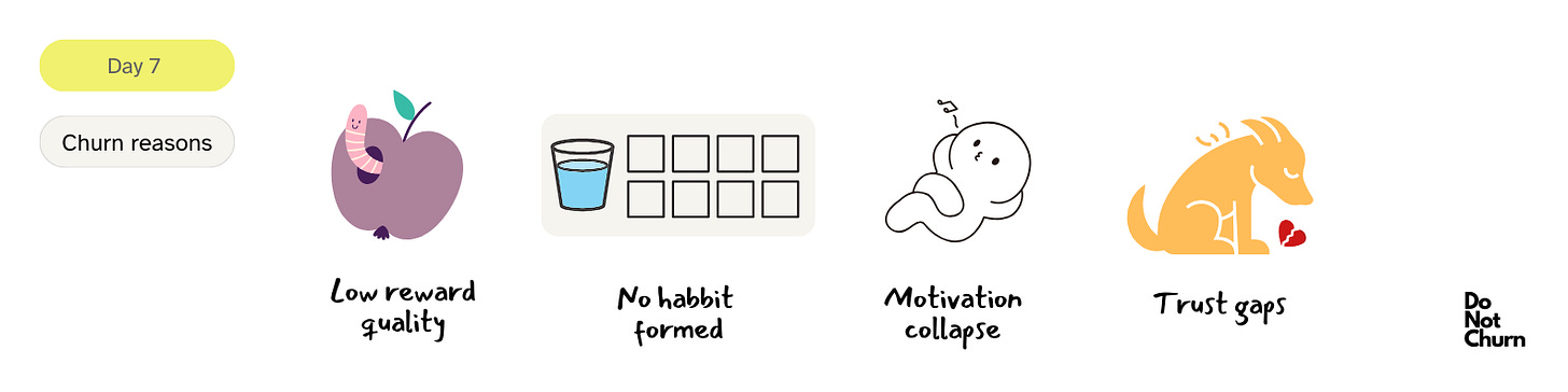 This can be about a skill that’s improving, relevance getting better, or effort paying off. If a user completes 3–5 actions and cannot articulate what’s improved, churn risk is high.