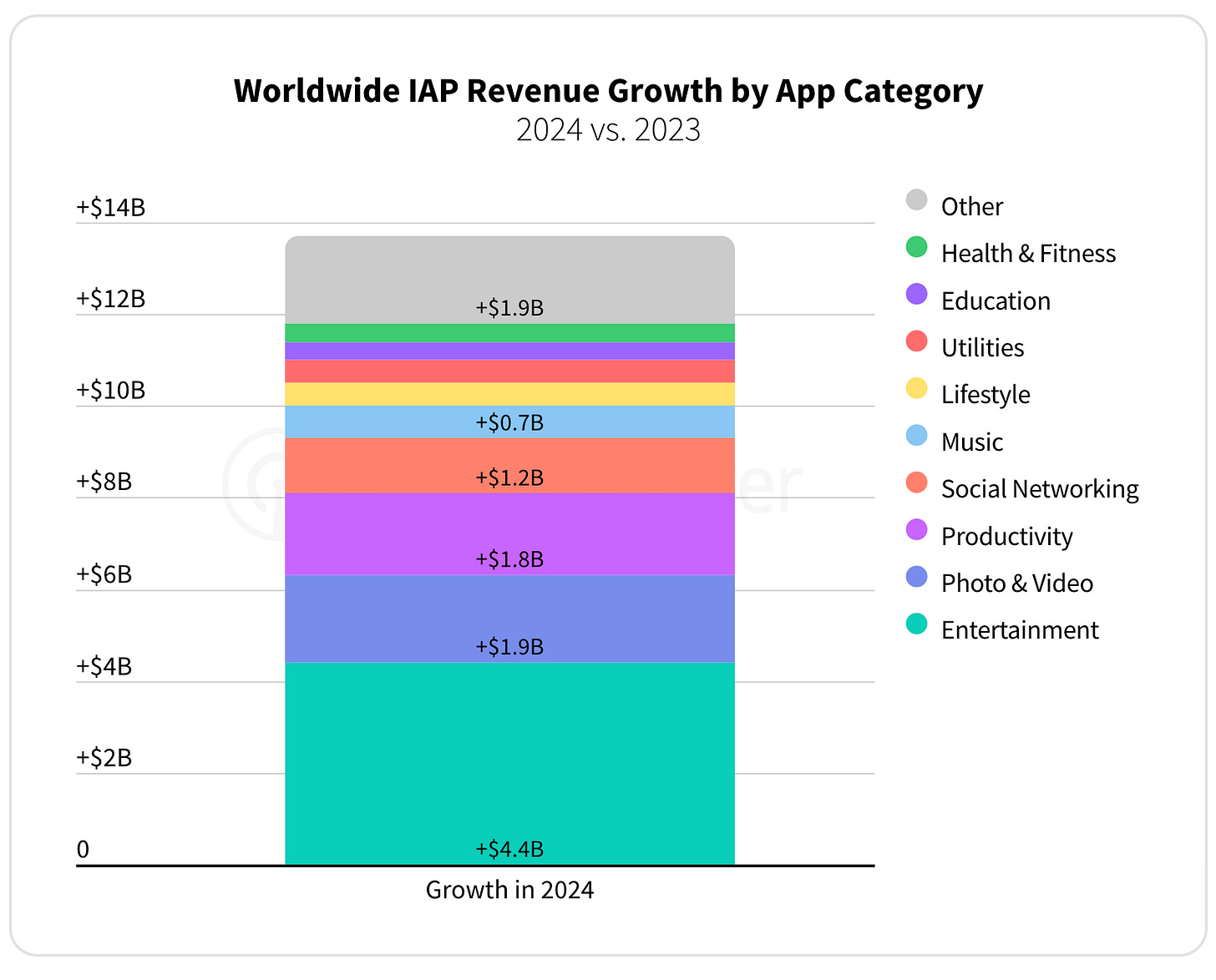 Apps gained nearly $14 billion in additional IAP revenue in 2024 alone (+25% YoY), well above the nearly $9 billion added in 2023.